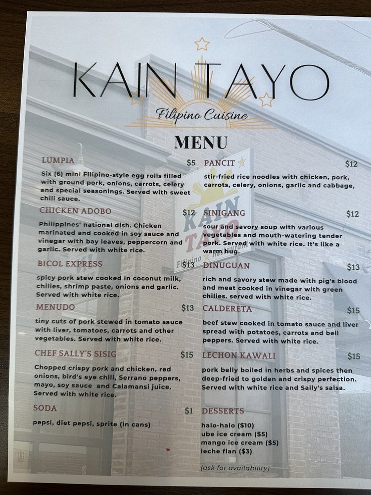 Kain Tayo is a beloved Filipino dessert spot in St. Louis that offers a warm and inviting atmosphere. Located at 2700 Locust St, this gem provides takeout options and outdoor seating for a delightful dining experience. Customers rave about the authentic and delicious Filipino cuisine served with love and care by Chef Sally. The menu boasts favorites like Chef Sally's Sisig and Ube Flan Cake, with dishes like Lechon Kawali and Kare-Kare receiving high praise. The friendly staff is known for their helpfulness in describing dishes and making dining suggestions, creating a warm and familial dining experience. Kain Tayo truly embraces its customers as family, providing a taste of home with each scrumptious dish. Enjoy a slice of Filipino culture and delectable desserts at Kain Tayo.